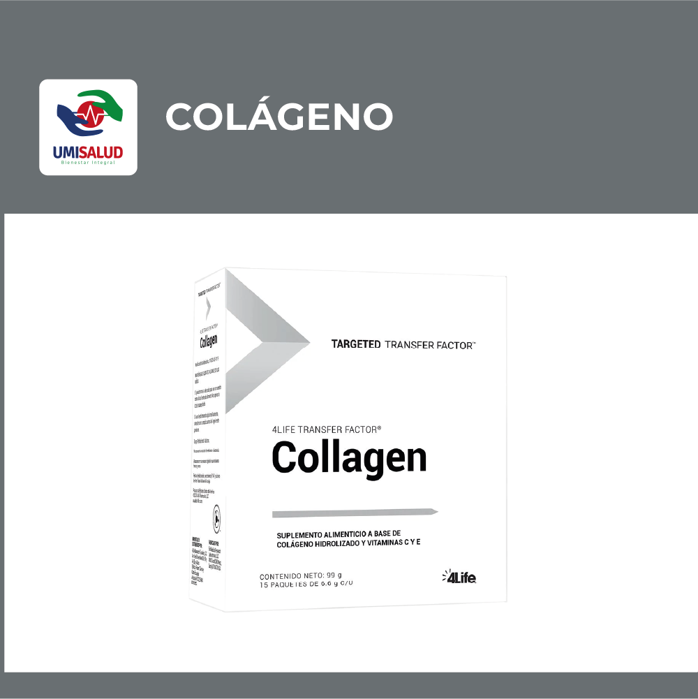 Suplemento alimenticio que incluye cinco tipos de colágeno, 4Life® Tri-Factor® Fórmula, vitaminas C y E.